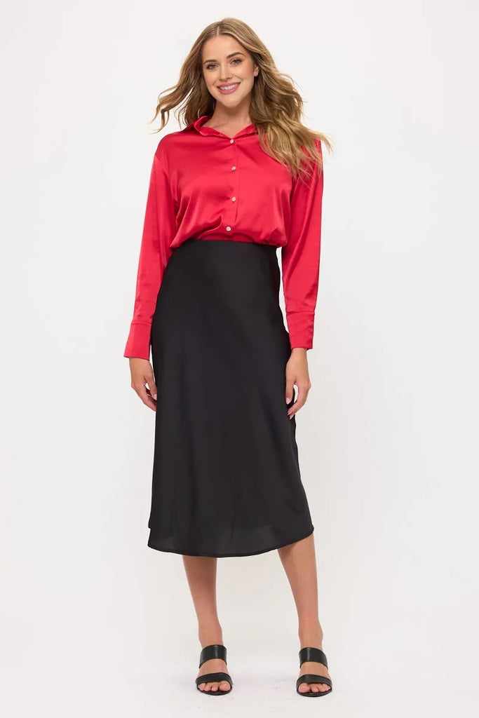 Features: Silky satin fabric with subtle sheen, Classic pointed collar, Full front button closure with pearl-like buttons, Long sleeves with wide button cuffs, Relaxed fit, perfect for tucking or leaving loose, Drapes beautifully for a flattering silhouette,