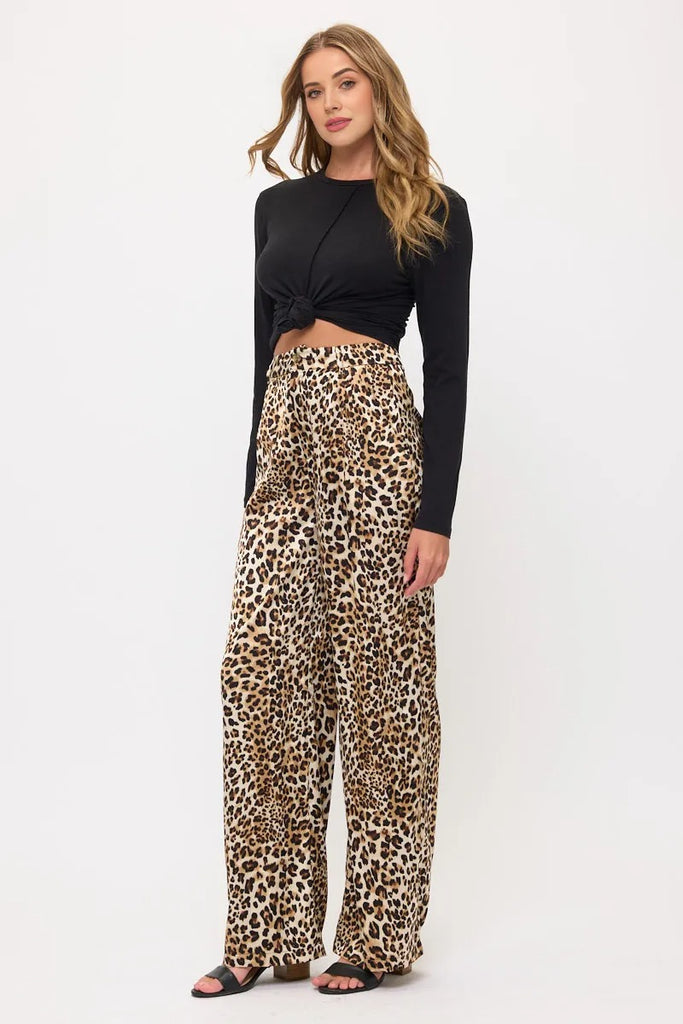 Crafted from premium satin fabric, these pants offer a smooth, glossy finish that feels as good as it looks. The dramatic leopard print brings a touch of wild sophistication, while the wide-leg silhouette drapes beautifully for an effortlessly chic look.
